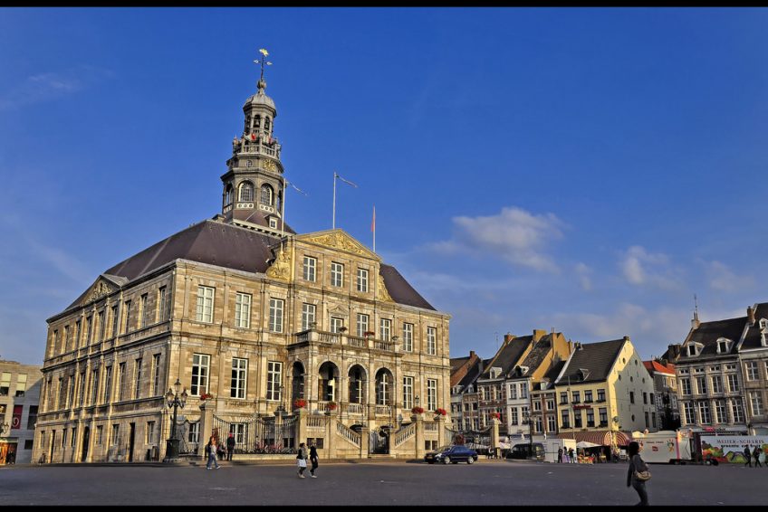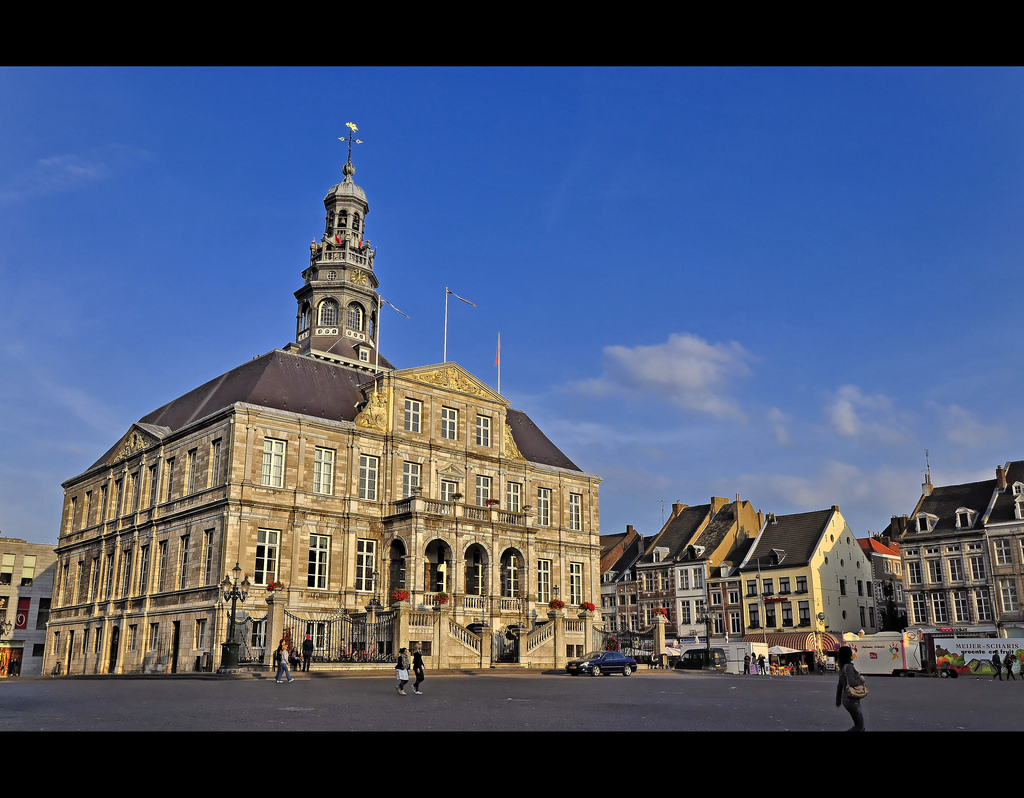 熱鬧的集市廣場的焦點是馬斯特里赫特市政廳荷蘭巴洛克式的Stadhuis。荷蘭城市馬斯特里赫特的市政廳,位於馬斯特里赫特的市中心。馬斯特里赫特市政廳被認為是荷蘭古典主義建築的代表作。它建於1650年代的布料大廳,以其精緻的新古典主義外觀而聞名,這裡有一個漂亮的雙層樓梯。