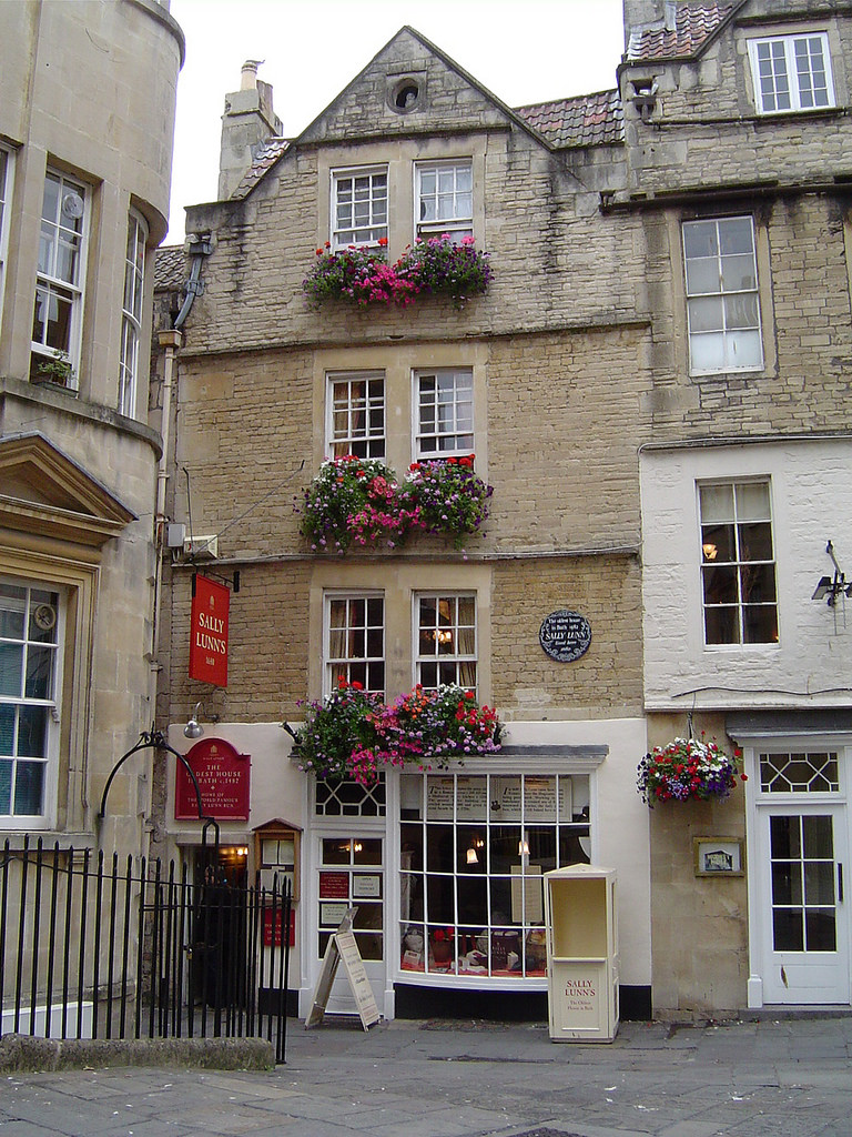 1680年一个名叫Solange Luyon年轻人为了躲避法国国内的迫害逃到了巴斯。她最初为Lilliput Alley街上的一家面包店工作,在巴斯大教堂附近兜售烘焙用具。但是Solange有法国烘焙面包的独家技艺,她可以制作出绵软独特的奶油面包,再配着甜或咸的酱料,这种面包很快就俘获了当地群众的胃。这款面包本来由她的名字命名,但是因为她的同事发不准她的法语名字,久而久之就变成了Sally Lunn,也就有越来越多的人来的这家小店要吃Sally Lunn Bun。