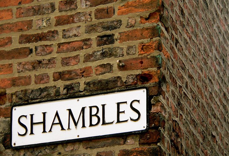 在約克時,參觀Shambles是必須的。 “Shambles”有時被用作扭曲,狹窄的小巷的迷宮的總稱,使約克如此迷人。其核心是實際上被稱為Shambles的小巷,可以說是世界上保存最完好的中世紀街道。在1086年的征服者威廉的世界末日書中提到過。今天街上的許多建築可以追溯到十四世紀末和十五世紀(約1350-1475)。