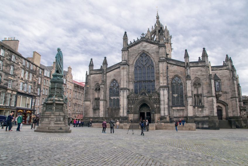 正確地稱為愛丁堡的高柯克(它只是一個真正的大教堂 – 主教的所在地 – 從1633年至1638年和1661年至1689年),教堂以跛腳和乞丐的守護神命名。內部缺乏宏偉但歷史悠久:1126年在這裡建造了一座諾曼風格的教堂,但在1385年被英國入侵者摧毀(唯一的大型遺跡是支撐塔樓的中央橋墩)。聖吉爾斯是蘇格蘭宗教改革的核心,約翰諾克斯從1559年到1572年在這裡擔任部長。