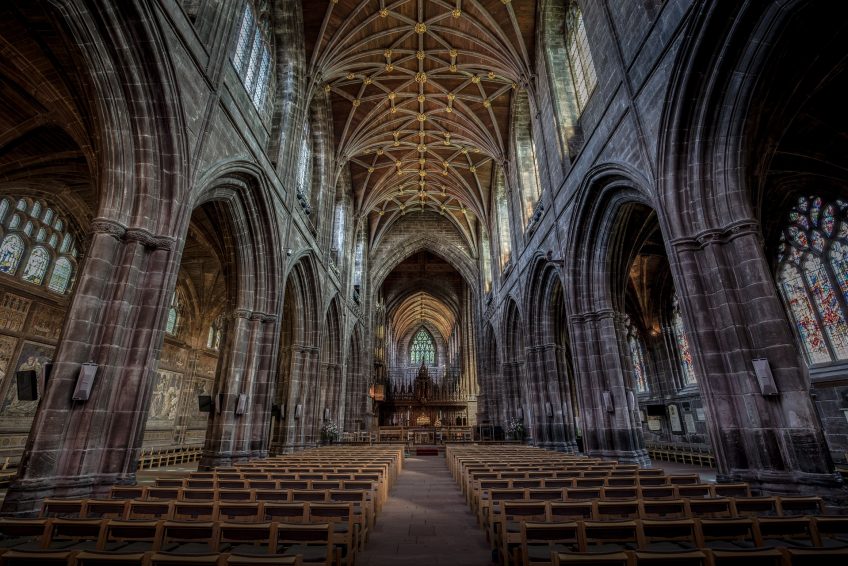 1904年至5月,Pugin&Pugin的Nave-and-aisles Gothic Revival教堂位于红色Dumfriesshire砂岩中,细节清晰。高耸的拱形内部 – 从地板50英尺到屋顶的顶点。支撑屋顶主肋的轴支撑在用各种乐器演奏的天使雕刻精美的牛腿上。丰富的松树和美国橡木长椅的家具。教堂由十一个过道和十四个天窗照亮。