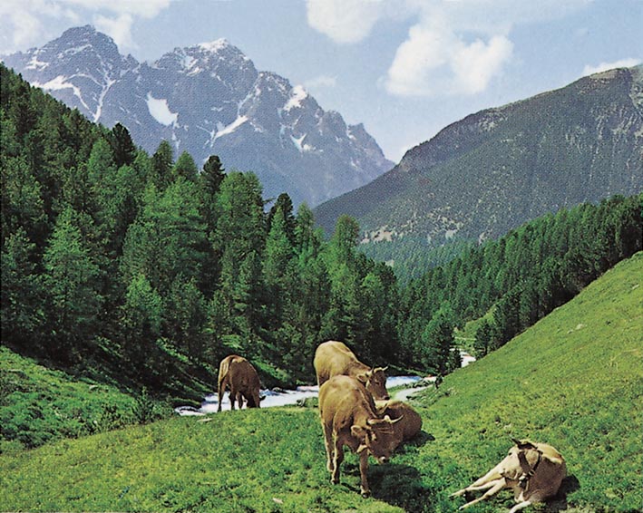 較低的恩加丁山谷(Engadine Valley)是瑞士國家公園(Swiss National Park)的家園,佔地67,000英畝的野生動物保護區,是阿爾卑斯山壯麗的象徵。公園的三分之一包括高山森林,另外三分之一的阿爾卑斯山草甸和其他山脈。該公園於1914年8月1日在瑞士獨立日成立,是歐洲首批國家公園之一,也是瑞士唯一的國家公園。