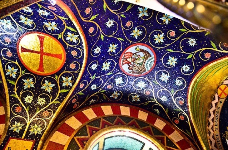 大教堂的建築師John Francis Bentley在1903年開放之前就去世了,但眾所周知,用馬賽克覆蓋廣闊的內部至少需要一個世紀。一些抗議認為,個人馬賽克藝術家的設計與賓利的原始拜占庭視覺發生衝突。