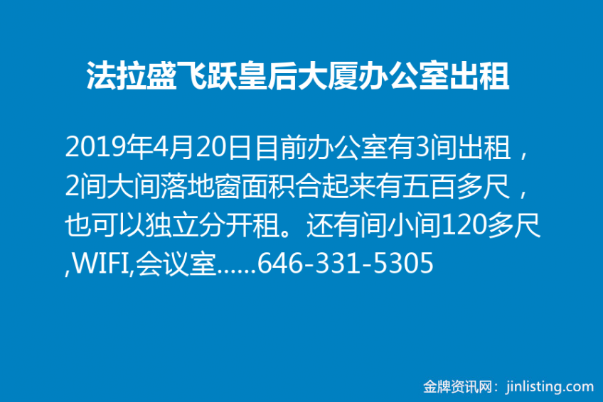 法拉盛飞跃皇后大厦办公室出租 646-331-5305