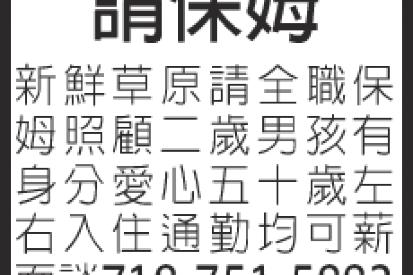 新鮮草原請全職保姆,照顧二歲男孩.有身份.愛心,五十歲左右.入住通.勤均可。薪面談。電718-751-5883