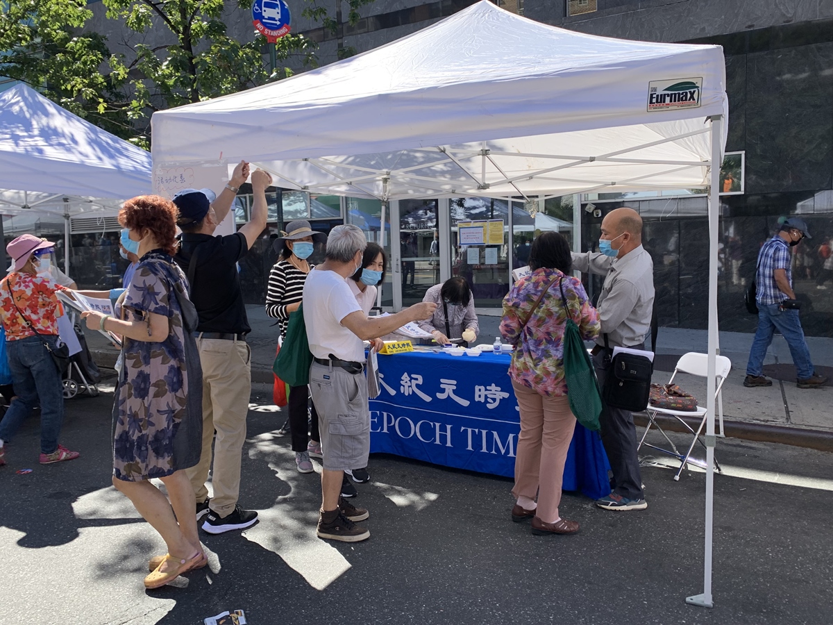 “新唐人户外健康展”在法拉盛凯辛娜大道户外举办。《大纪元时报》摊位。(林丹/大纪元)