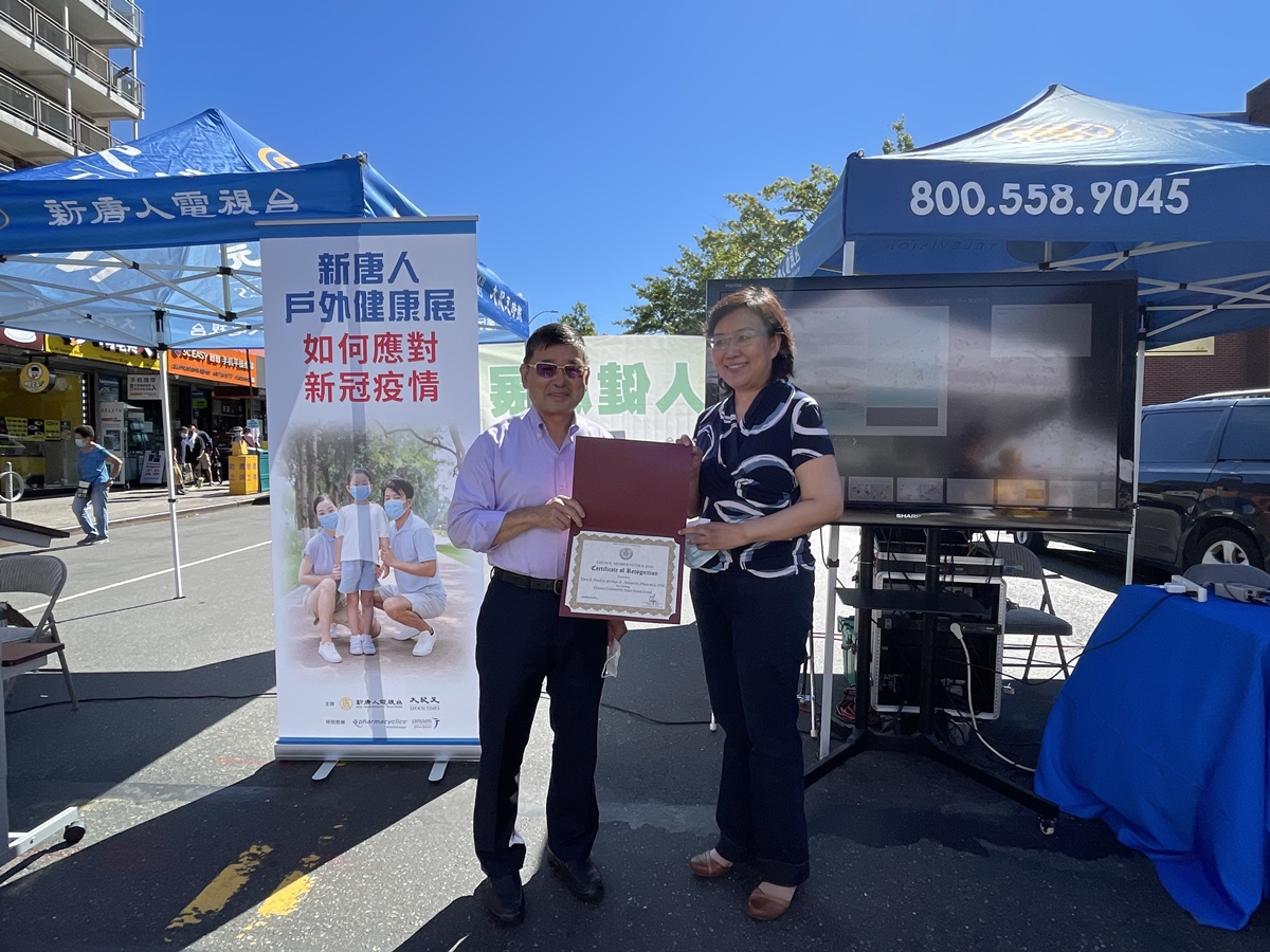 市议员顾雅明(左)向新唐人健康展颁发褒奖,称赞新唐人健康展带来民众所需的健康和防疫讯息。(林丹/大纪元)