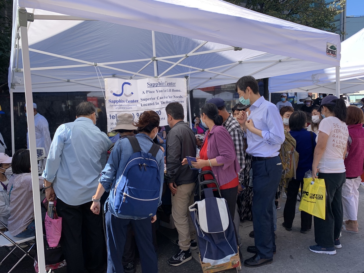 “新唐人户外健康展”在法拉盛凯辛娜大道户外举办,带来防疫资讯和疫苗知识。(林丹/大纪元)