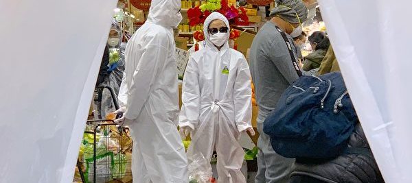 7日,法拉盛长江超市,有两名购物的华人身穿全套白色防护服,从头包到脚,戴着黑色墨镜,全身裹得严严实实在超市内买菜。而收银的超市老板娘也穿上了防护服。