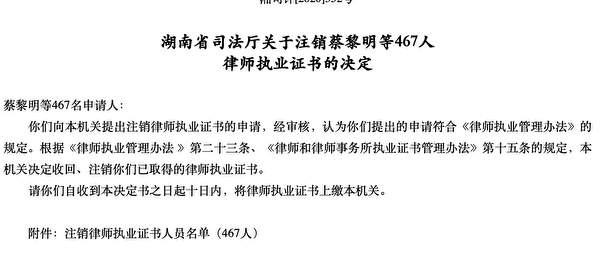 中共越来越收紧言论,打压维权律师。近期在全国范围内对律师的打压整治行动中,光是湖南省一省就有上千名的律师失去了律师执业证书。据湖南省司法厅官网显示,从今年4月7日起至8月27日止,总数已注销了1,267人的律师执业证。被吊销律师证的谢阳律师认为这只是个前奏,接下来当局对律师的管控会越来越严。