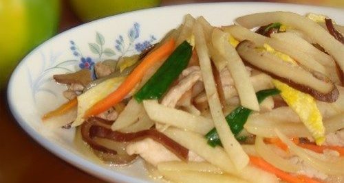 3、热油锅,下葱白及蒜末炒香,再下肉丝、红萝卜、木耳及鲜香菇炒至7分熟,下豆薯、葱绿炒至肉丝熟透,加适量的盐及蛋丝拌炒一下即完成,口感很清爽喔!