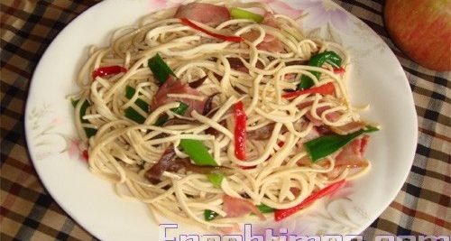 培根2片、豆干丝150克、木耳1朵、甜红椒1/4个、葱1支、盐适量。
