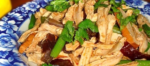 炎热的天气里,为了增进食欲,特向读者介绍“红油鸡丝”,所采用的食材是以高蛋白低脂肪的鸡胸肉为基底,辅以富含辣椒素和维生素C可开胃醒脾的红油(辣椒油),富含蛋白质的豆干,富含植物胶质和多糖体可抗癌的黑木耳,富含水分和纤维可减肥的芹菜,富含大蒜素和硫化合物可杀菌抗癌的大蒜,富含精油和胡萝萄素可去腥醒脾的香菜,故能达到开胃爽口、增进食欲、健康养生的效果。