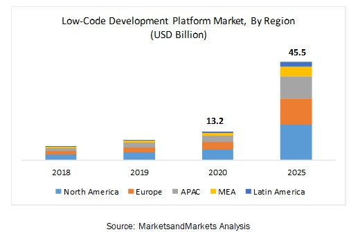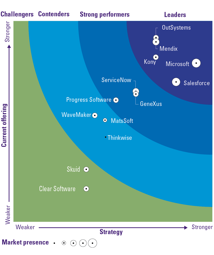 目前非常多的公司都在投入重金做低代码开发,包括微软、Salesforce, OutSystem, 国内有百度,阿里巴巴等,因为这个就是未来的发展方向。微软推出的产品是Power Platform. 微软自己说Power Platform是从微软三个拳头产品:Office 365, Dynamics 365, Azure 中抽取出来的精华构成的。Power Platform首要目的就是用来做微软的Dynamics CRM的开发,所以Power Platform Functional Consultant也被叫做Dynamics 365 Functional Consultant. (右图:微软在低代码开发领域处于领导地位)