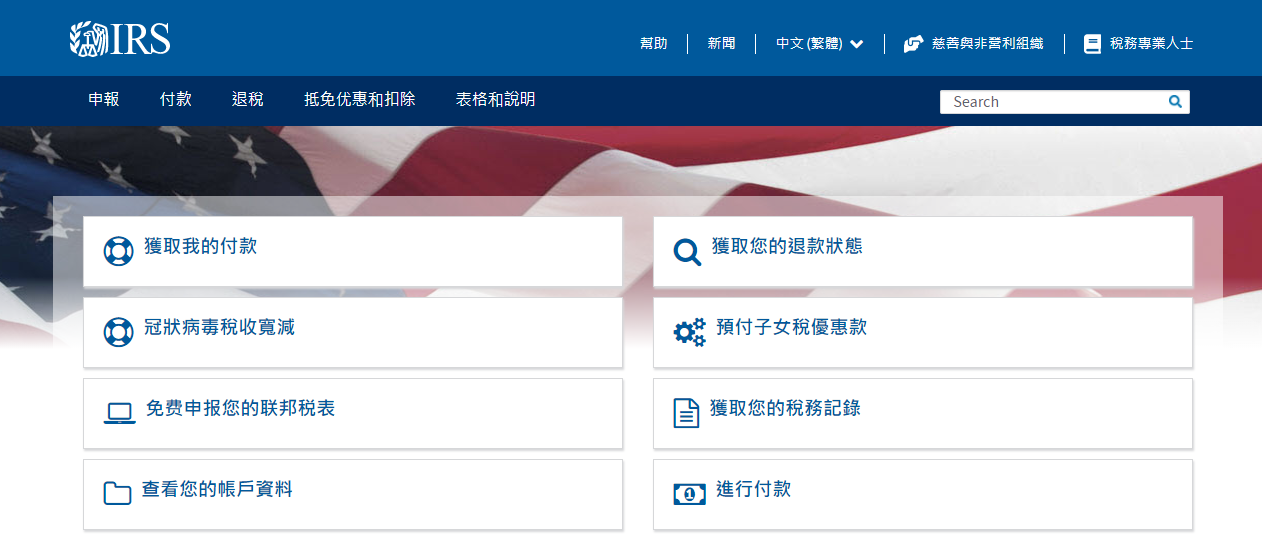 美国国税局(IRS)正体中文网页请登录 https://www.irs.gov/zh-hant;简体中文网页请登录 https://www.irs.gov/zh-hans。