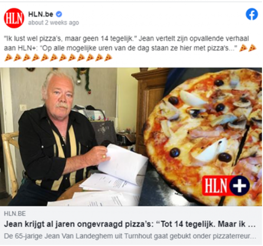 《独立报》(the Independent)报道,现年65岁的蒂伦豪特区(Turnhout)居民让·范·兰德海姆(Jean Van Landeghem)表示,外卖司机全天候不分昼夜的将比萨饼带到他家门口。据报道,这种情况已经持续了近十年,德海姆说他不知道为什么。