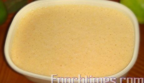 3、芒果牛奶汁倒入容器,放进冰箱的冷冻库约3小时(容器越大时间越久),等芒果牛奶汁成芒果冰块。