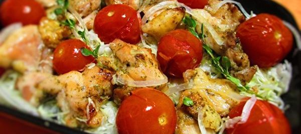 3、装盘时,底下盛放高丽菜丝、上放鸡肉,其上方散放洋葱丝、香草;将烤出的鸡油当沙拉淋汁,适量淋上即成。