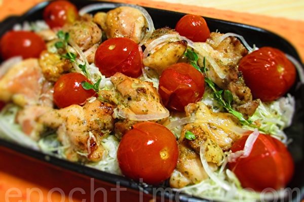 2、烤箱高温预热5分钟。同时,取浅盘,装入鸡肉块,块块分开;放入烤箱中以180度烤,中途,打开烤箱,肉块间散加入小蕃茄同烤。烤出金黄色(约10~1 5分钟),翻开一下内面,鸡肉转白色即熟。