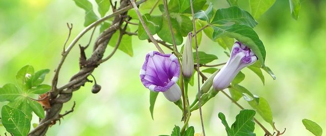 牵牛花看上去挺像是吹奏乐器喇叭,漏斗状的花冠有如喇叭口而宛若丝绢,微长的花管有如喇叭管且莹洁如玉,故而亦称“喇叭花”。她们一般只在早晨日出之前开放,在日本有“朝颜”之称。太阳出来后,牵牛花会渐渐谢去。倘若天气多云或阴,见不到太阳时,花则一直坚持开到中午,甚至下午。