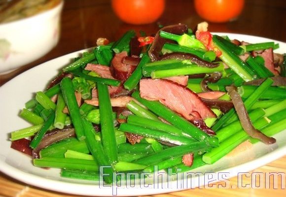 3、起油锅,下腊肉、辣椒炒香,再下韭菜花、木耳、盐拌炒即完成。