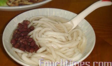 2、但村妇们须事先作好米苔目备用,才有时间应付当天插秧割稻的农忙琐事。她们先将在来米洗净,浸泡约3至4个小时,将在来米掏进“磨石”(现可改用方便的磨浆机)的洞口磨成米浆后,装入布袋封口,再用扁担及绳索绑牢在长板凳上,以压出水分后成为“生浆团”。再取三分之一的生浆团煮熟,与剩余的生浆团拌揉成光滑的“米团”。最后用米苔目成型板(打洞孔的铁板)将“米团”用力挤压成米条,再放入沸水中煮至浮起,捞出后立即放入冷水中冷却,沥干后即完成。