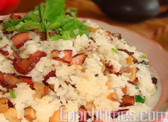 糯米300克、腊肉50克、姜末少许、虾米20克、干香菇15克、酒少许、香菜少许、盐适量(因腊肉具咸味)。