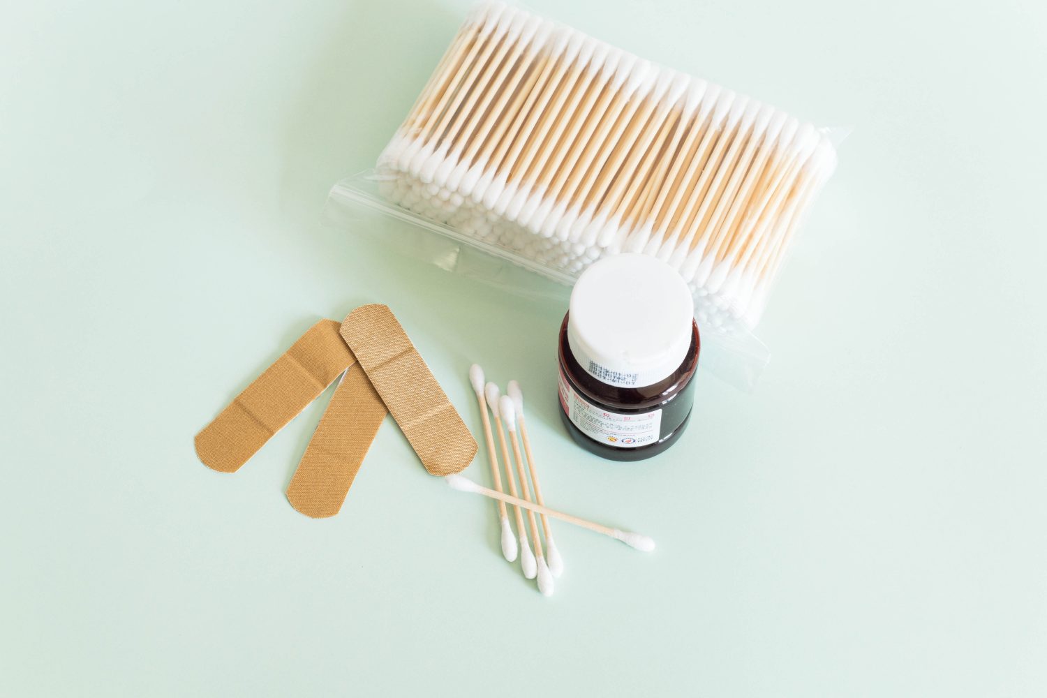 处理擦伤的创可贴、消毒药水、纱布、棉签等。