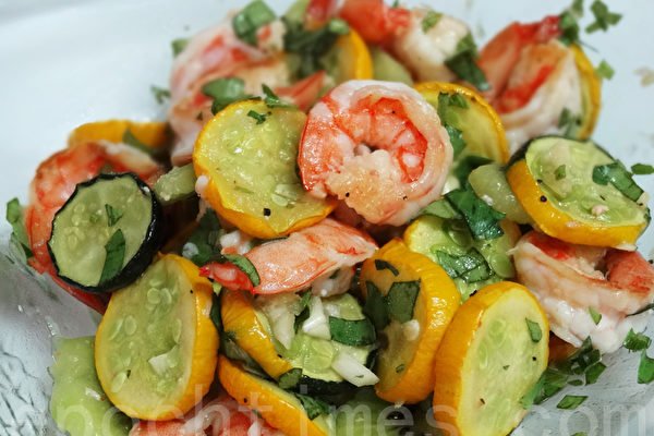 4.取一容器,放入烤好的节瓜片、烙熟的鲜虾、切妥的奇异果片和各调味料、橄榄油,轻轻拌匀后即可食用。