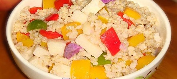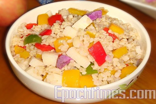 3、热锅加少许油,放入山药略炒一下,再放甜椒炒片刻,加一点盐巴调味后起锅。倒在糙米、薏芢饭内拌匀即完成。