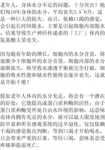 特别是,进入成年后,渴的感觉会逐渐减少,我们的身体内部的水分会越来越少。随着年龄的增长,体内细胞的重叠量也会逐渐减少,细胞内的增多量,与细胞外表面积量之比从1:1,减少至大约0.8:1,也就说是进入老龄后,每十年身体内部损失3升以上的水。