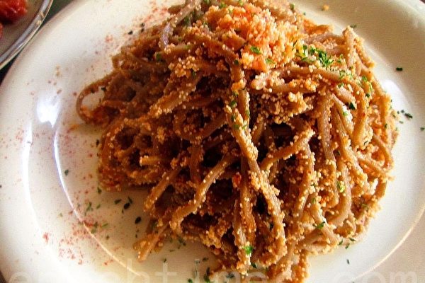 1、中火起平底锅,放入橄榄油,入荞麦面和鱼卵和炒,搅动面条让鱼卵黏附面条上。煎炒约2~3分钟,鱼卵转熟即可起锅。