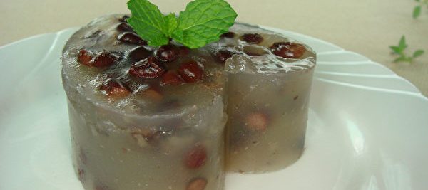 四、容器抹少许油,把糊状的红豆马蹄浆倒进容器内,放入电锅蒸30分钟即完成。
