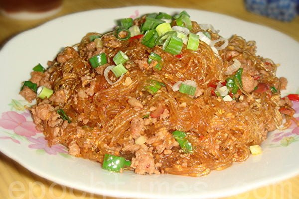 加酱油、糖及水,用大火煮开,放粉丝,改小火,用锅铲翻动粉丝。(摄影:林秀霞 / 大纪元)