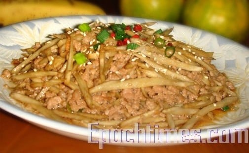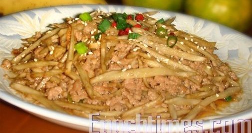 3、热油锅将牛蒡丝过油(软化纤维)捞起沥油,锅内留少量油将蒜末炒香,放入绞肉炒至8分熟,再放入调味酱煮至香味释出,再下牛蒡丝拌炒剩少许汁液后盛盘,最后撒上熟的白芝麻即完成。