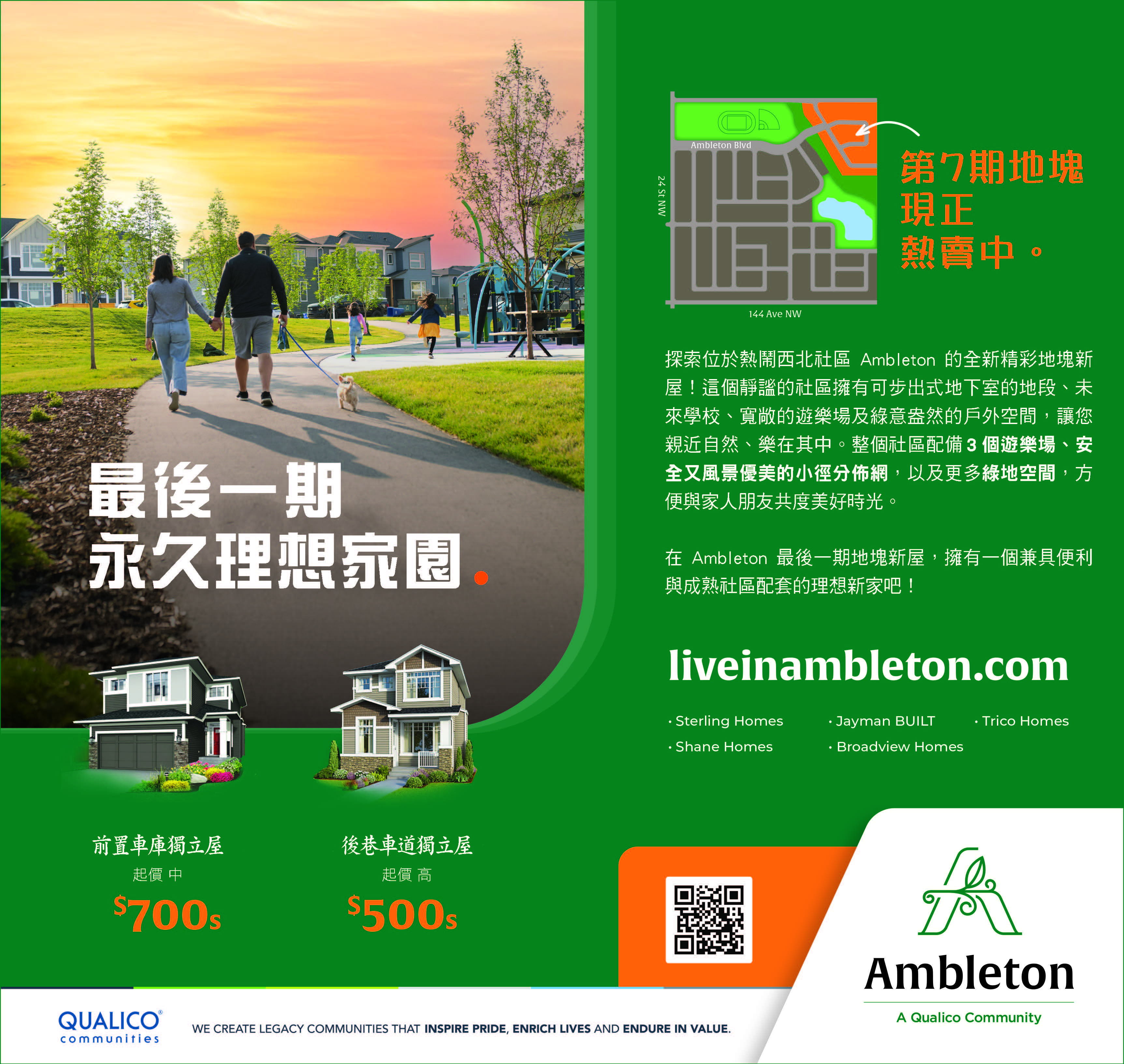 卡尔加里/卡加利/卡城/卡城西北区/卡城新北区/华人热门社区/Ambleton社区/https://liveinambleton.com /Qualico Communities 房地产开发商/Qualico 集团/建筑商/Shane Homes/Sterling Homes/Trico Homes/Broadview Homes/Jayman Built/Truman Homes/亚伯塔省/Calgary/Alberta/