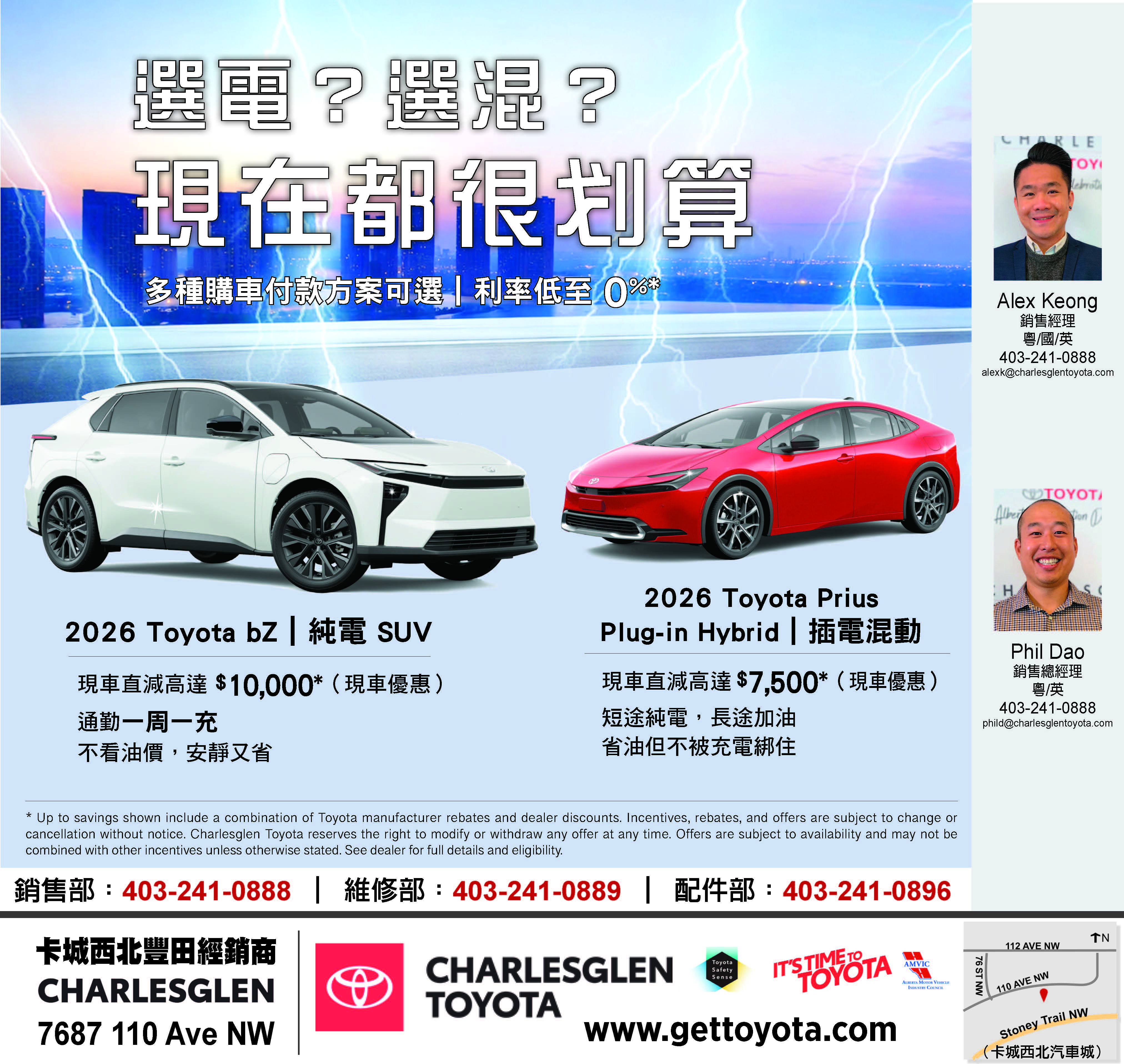 Charlesglen Toyota/Charlesglen丰田车行卡尔加里丰田车行/卡加利丰田车行/卡城丰田车行/卡城西北丰田车行/卡尔加里二手车买卖/2016-2018年度最佳经销商/2017 Toyota President’s Club和Pinnacle Awards/众多读者选择奖/7687 – 110 Avenue NW/(403) 241-0888/Calgary/Alberta/Alex Keong/