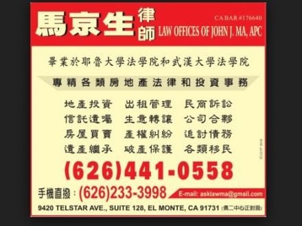 马京生律师事务所 – Ma , John J., Law Offices电话626-441-0558;626-233-3998