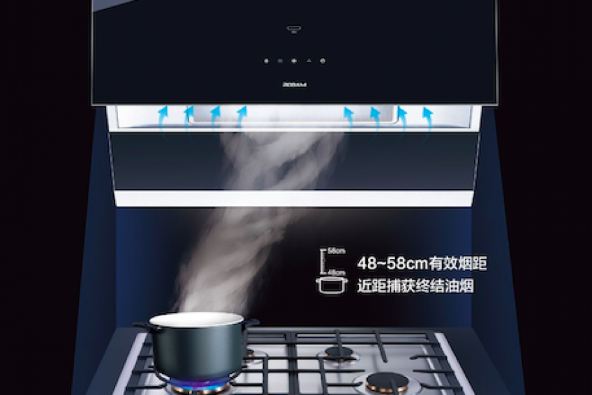 老板电器最新推出的双腔大吸力油烟机,采用最新科技,双腔双吸,实现1秒控烟: