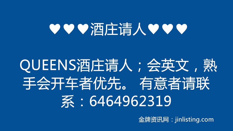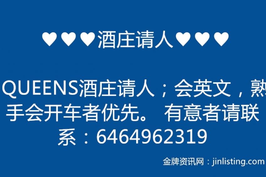 ♥♥♥酒庄请人♥♥♥ QUEENS酒庄请人;会英文,熟手会开车者优先。 有意者请联系:6464962319