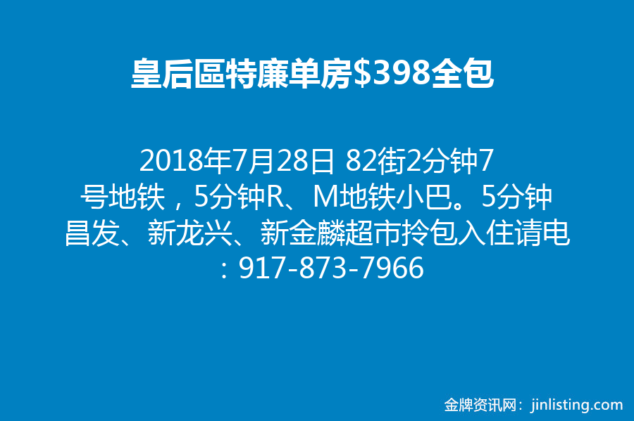 单房廉租$398, 皇后區82街2分钟7号地铁,5分钟R、M地铁小巴。5分钟昌发、新龙兴、新金麟超市,购物特别方便。房内大窗,简单傢俱,水电煤全包,有上网线wifi,拎包入住。希望不烟酒,爱清洁单身男士或学生或兄弟。请电:917-873-7966手机,718-426-5929
