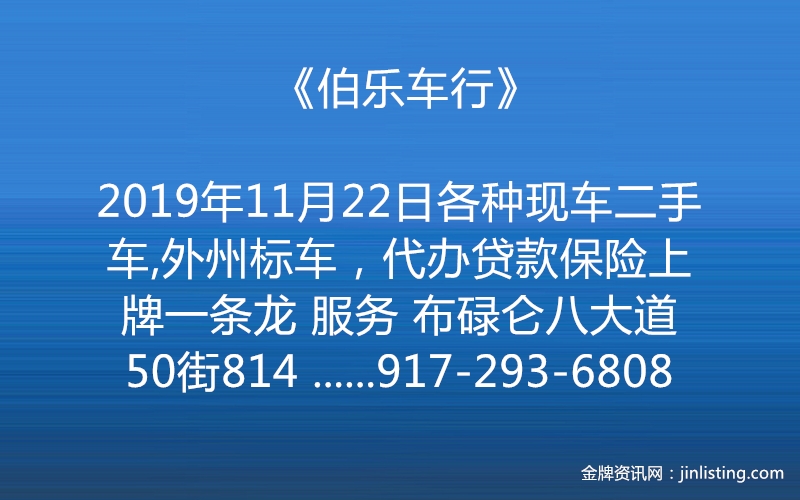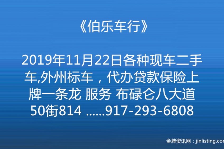 《伯乐车行》 各种现车二手车,外州标车,代办贷款保险上牌一条龙 服务 —… “—-布碌仑八大道50街814 ,各种二手车出售,,贷款保险年检一条龙- 车行10余台现车,任你挑选, 保证绝无事故,泡水车,90天,或3000非人为因素保修 让你购车更安全. 代客上牌低利息汽车贷款,保险一条龙服务 提供全面车辆检查,提供车辆完整历史记录,让您更安心 联系人:阿信 微信:axin5230 电话:917-293-6808 Email:axin9230@gmail.com 地址;814 50th steet brooklyn NY 8大道50街 ,”