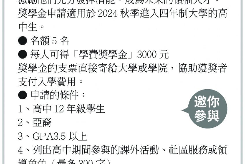 「未來亞裔領導力獎學金」 申請截止日期:4月15日