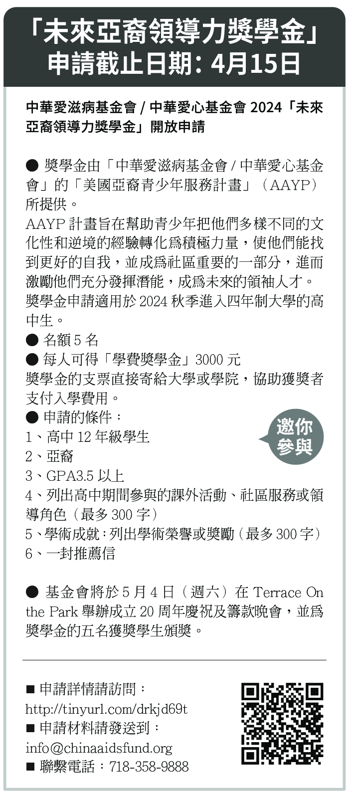 ● 獎學金由「中華愛滋病基金會/中華愛心基金會」的「美國亞裔青少年服務計畫」(AAYP)所提供。