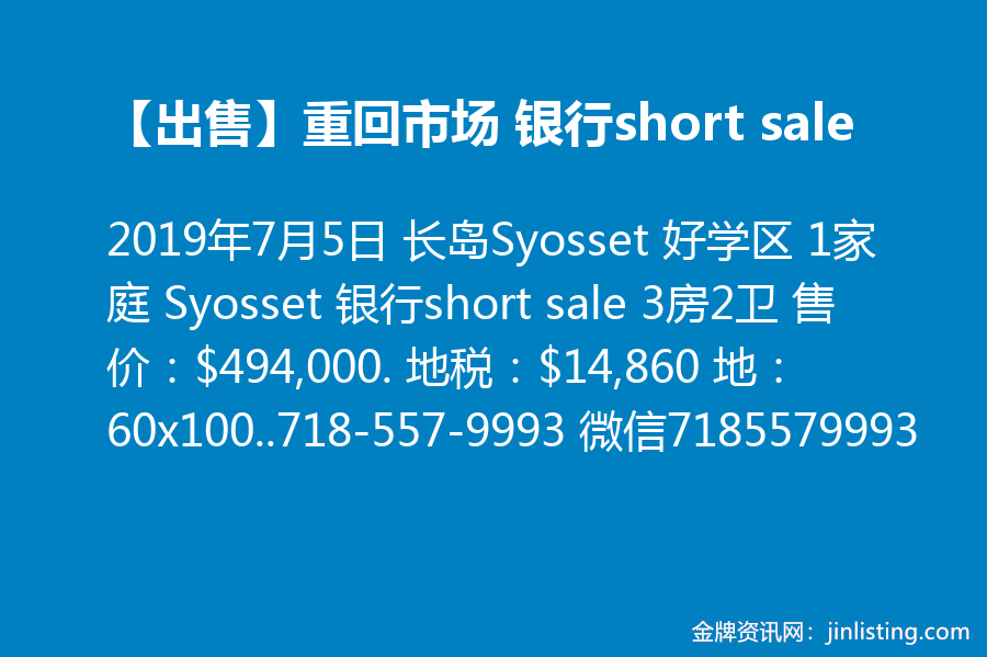 【出售】重回市场 银行short sale 长岛Syosset 好学区 1家庭 Syosset 银行short sale 3房2卫 售价:$494,000. 地税:$14,860 地:60×100。需全现金,基本装修。预约请联系顺成地产施先生, 电话:718-557-9993 微信:7185579993