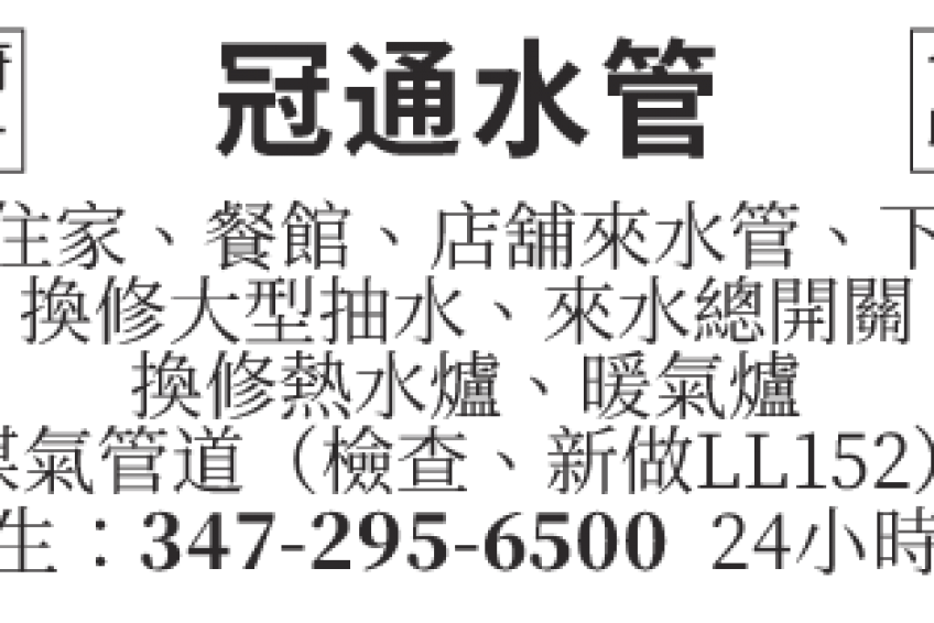 【冠通水管】347-295-9500 法拉盛通管 纽约地区 长岛 曼哈顿 布碌仑 专业通管 修漏水 热水炉