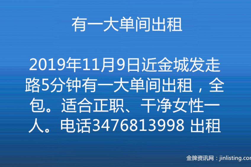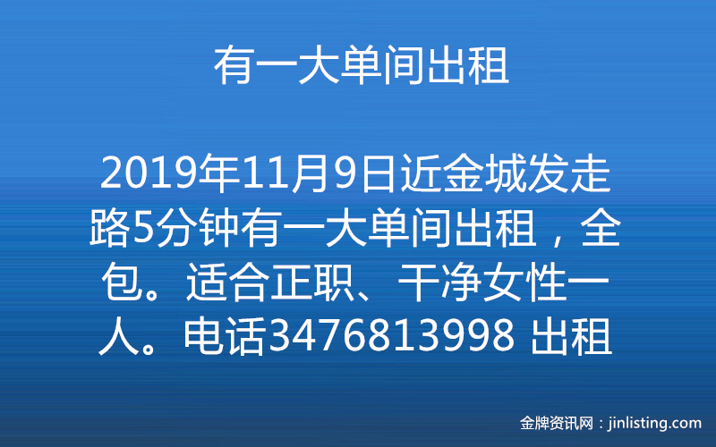 近金城发走路5分钟有一大单间出租,全包。适合正职、干净女性一人。电话3476813998 出租