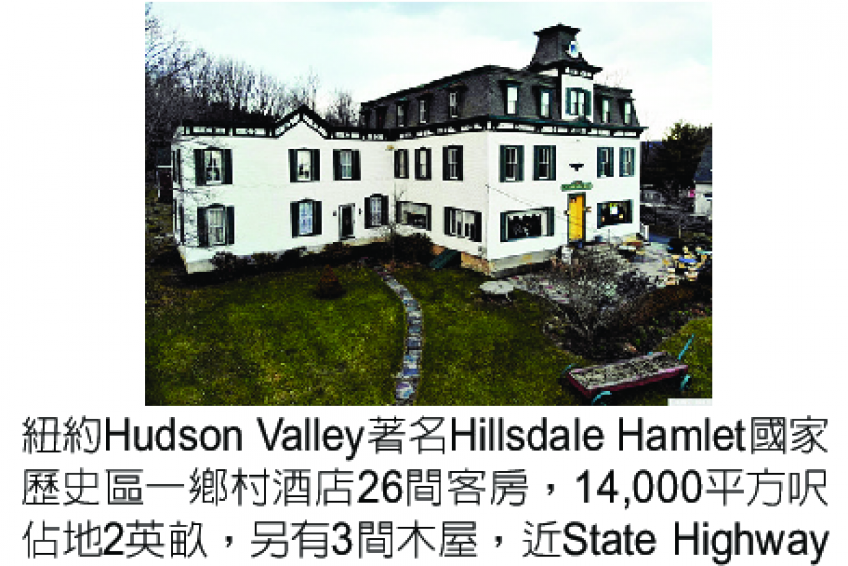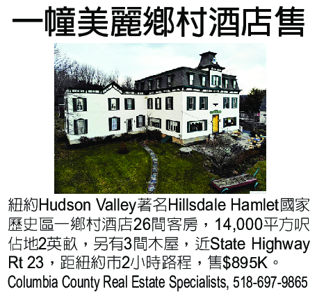 一幢鄉村酒店,26間客 房,14,000平方英呎,佔地2英畝,坐落在紐約Hudson Valley著名Hillsdale Hamlet 國家歷史區,另有3間木屋,風景極美,近State Highway Rt 23, 距紐約市2小時路程,售$895K, 電:Columbia County Real Estate Specialists, 518-697-9865