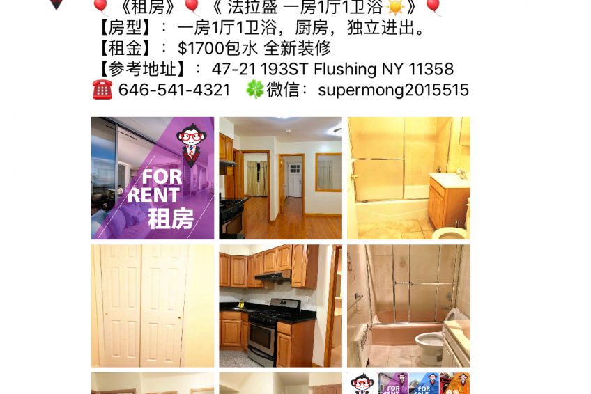一房一厅一卫浴,厨房。独立进出。租金:1700包水,全新装修。地址:47-21 193st Flushing NY11358联系电话:646-541-4321 微信:supermong2015515