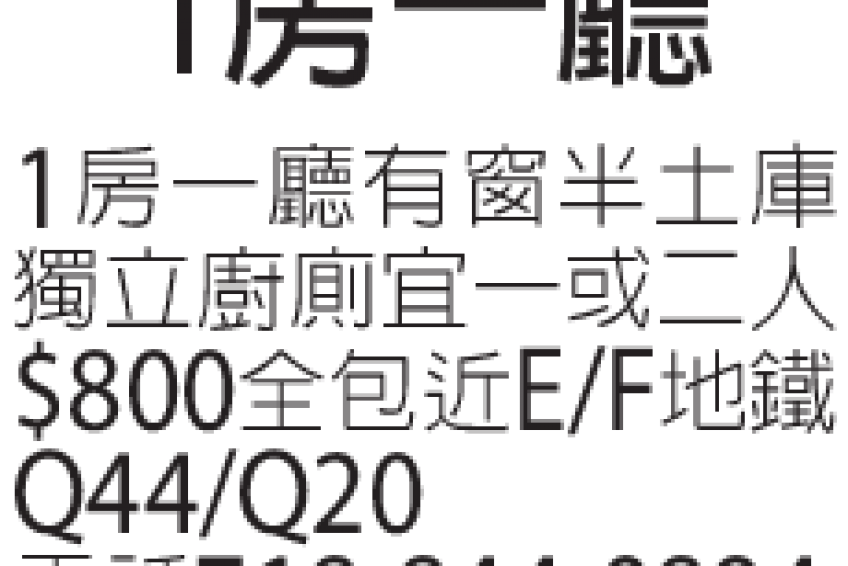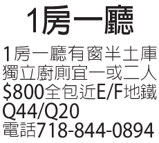 一房一廳 近EF地鐵Q44Q20有窗半土庫獨立廚廁宜一或二人800元全包718-844-0894